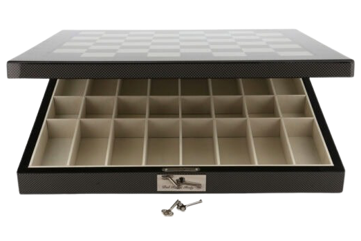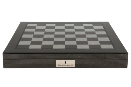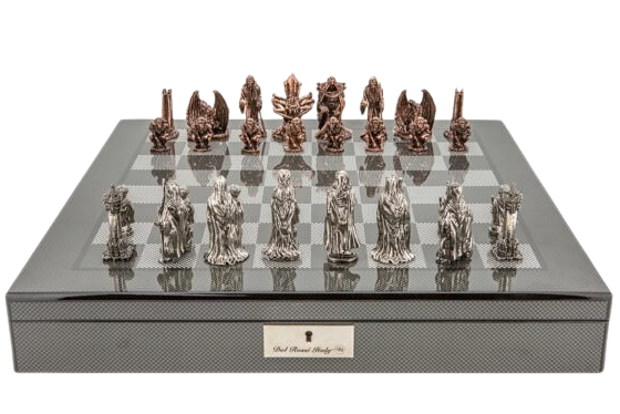 Delve into the realm of dark sophistication with the Dal Rossi Italy Evil Ring Metal Chess Set, presented in a captivating 20″ carbon fiber shiny finish chess box featuring convenient compartments.