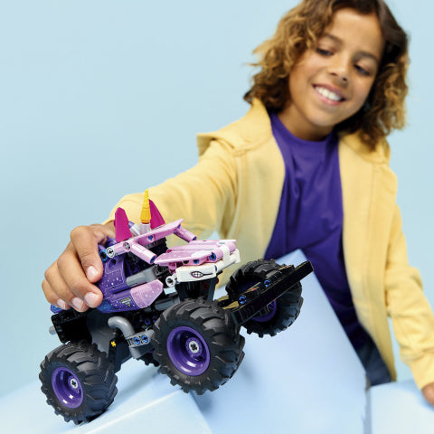 MONSTER JAM™ BUILDING TOY – The LEGO® Technic™ Monster Jam Sparkle Smash™ Pull-Back truck (42220) offers hours of play for boys, girls and kids ages 7+ who enjoy monster trucks and unicorn toys