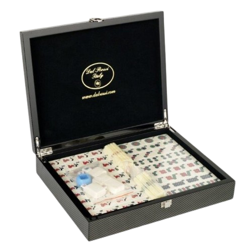 Dal Rossi Italy presents a luxurious Mahjong set, a masterpiece of craftsmanship and sophistication. This exquisite Mahjong set measures 29cm and comes enclosed in a stunning carbon fibre finish case, elevating the game to a new level of elegance.