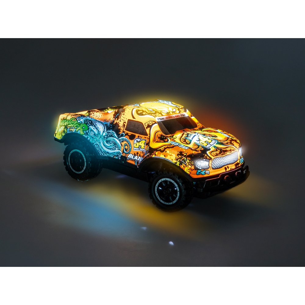 Discover the Revell Control RC Ghost Driver in bright orange, which will not only make children's hearts beat faster. With its compact dimensions of 175 mm long, 75 mm high and 90 mm wide, this speedster is a real eye-catcher. Recommended for racing drivers aged 6 and over, the RC Ghost Driver brings an extraordinary experience to your home. The elaborately printed bodywork combined with powerful LED lighting creates cool effects, especially in the dark. The precise 2.4 GHz remote control allows the vehicle to be controlled perfectly even at high speeds, making it ideal for young racing drivers who are just learning to steer.